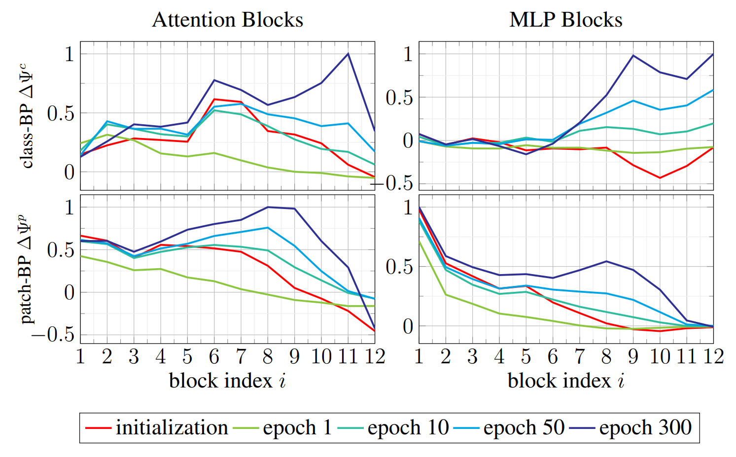 Figure 1: The relative feature improvement on classification token (upper row) and patches (botton row) for individual Attention and MLP blocks is depth dependent. Deeper layers express features only in later epochs.